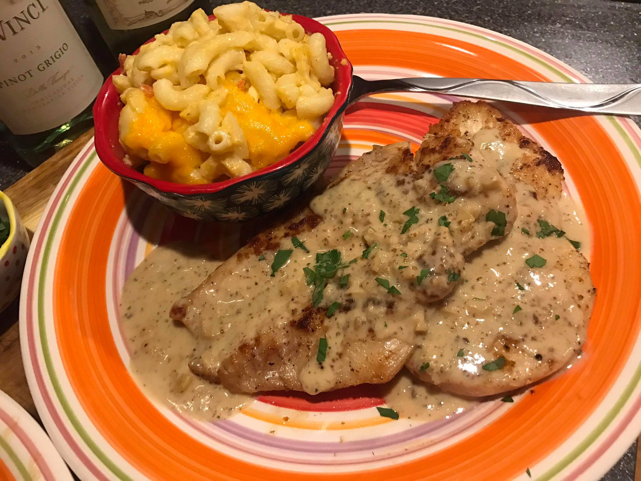 Place the chicken breasts on plate and spoon on a generous amount of sauce, then top it off with some freshly chopped parsley. I served it with a side of Creamy yet Spicy Macaroni and Cheese (click here for recipe). Enjoy!